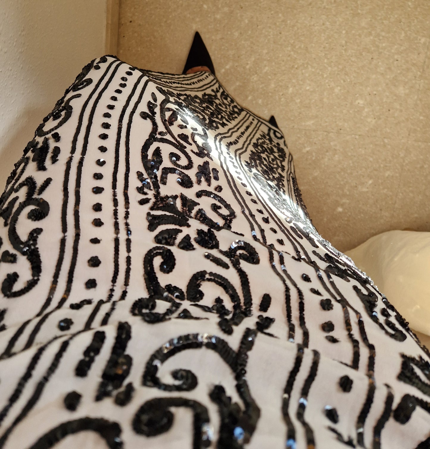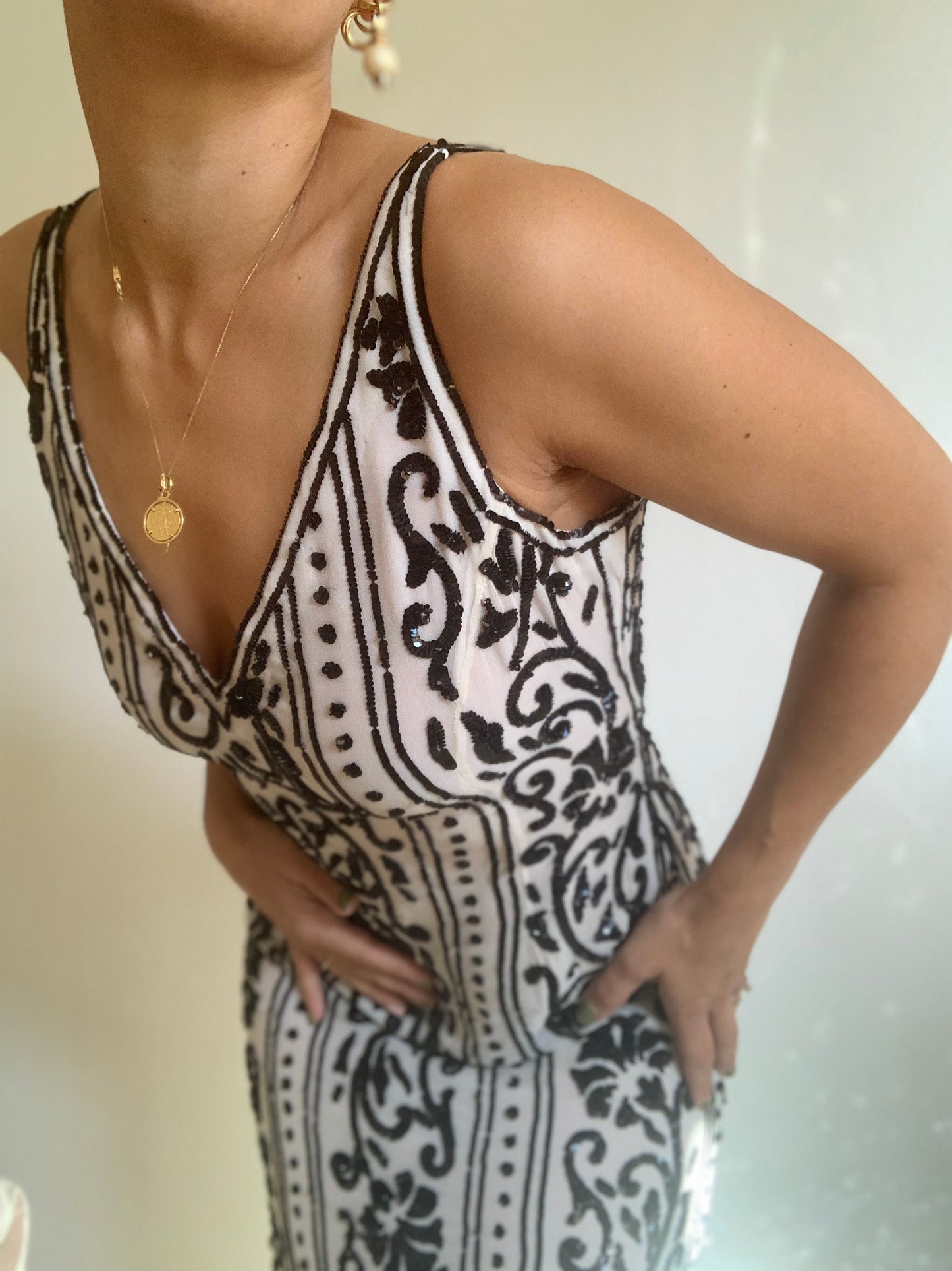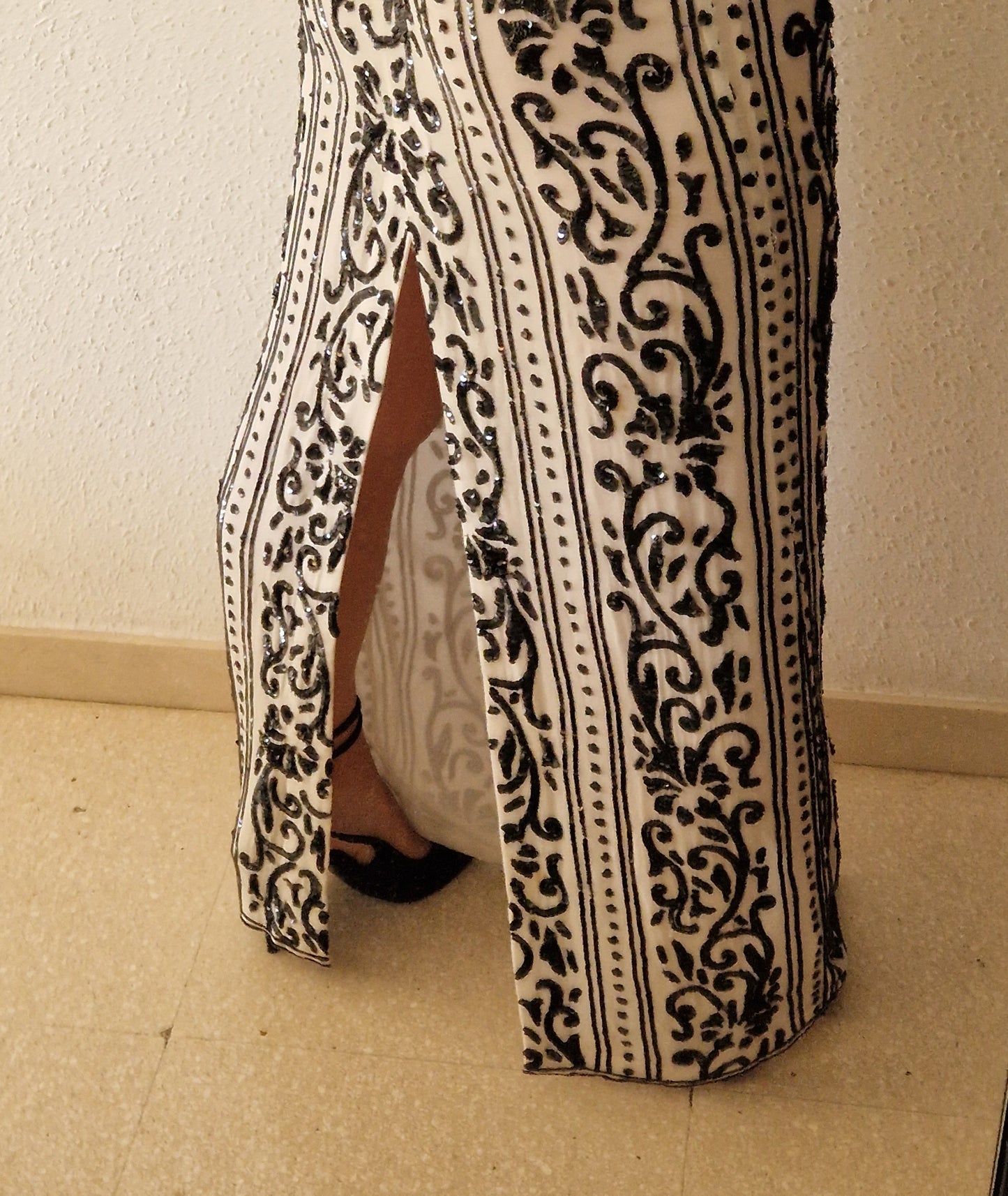 Vestido largo de seda y lentejuelas en blanco y negro talla M
