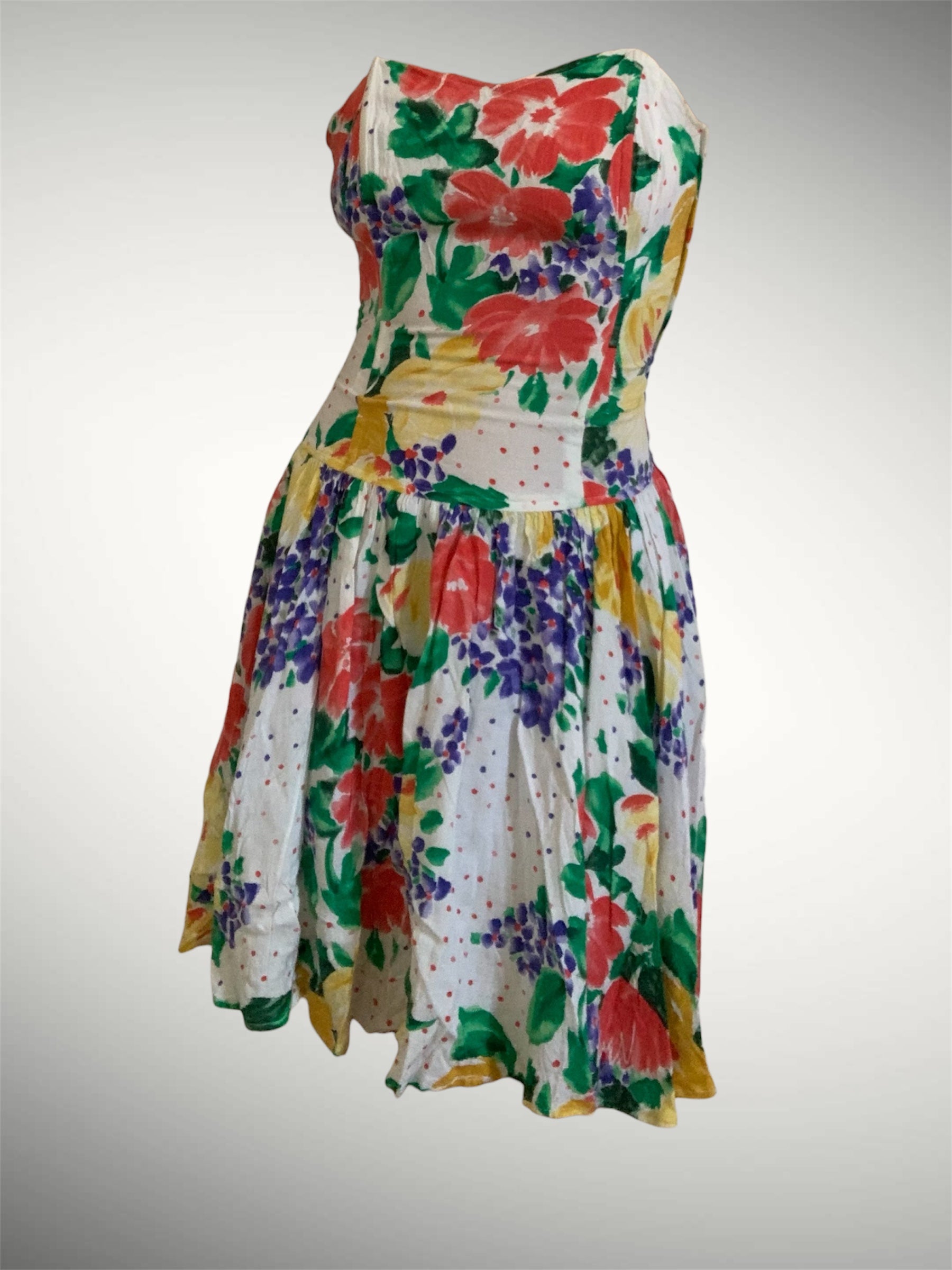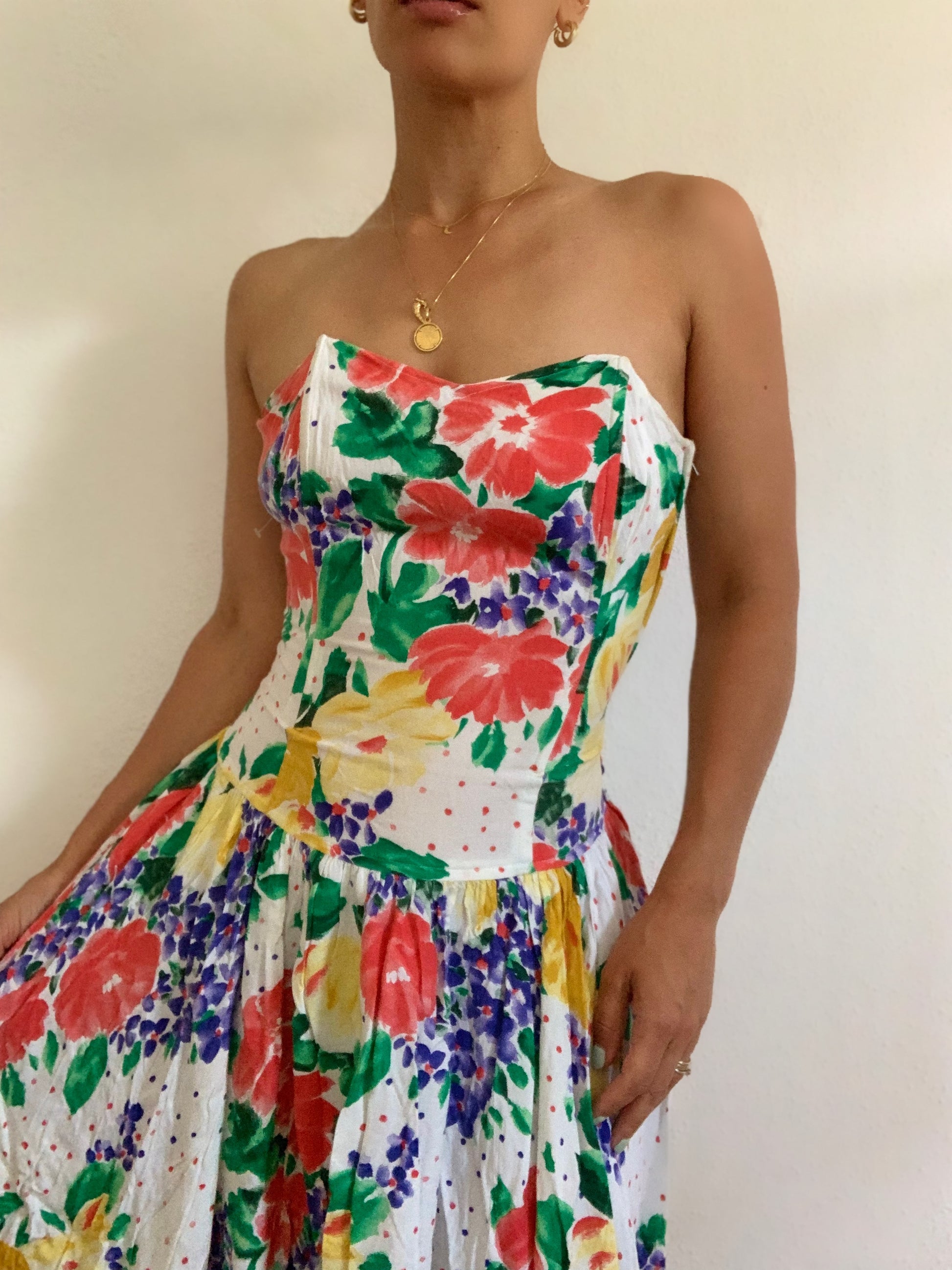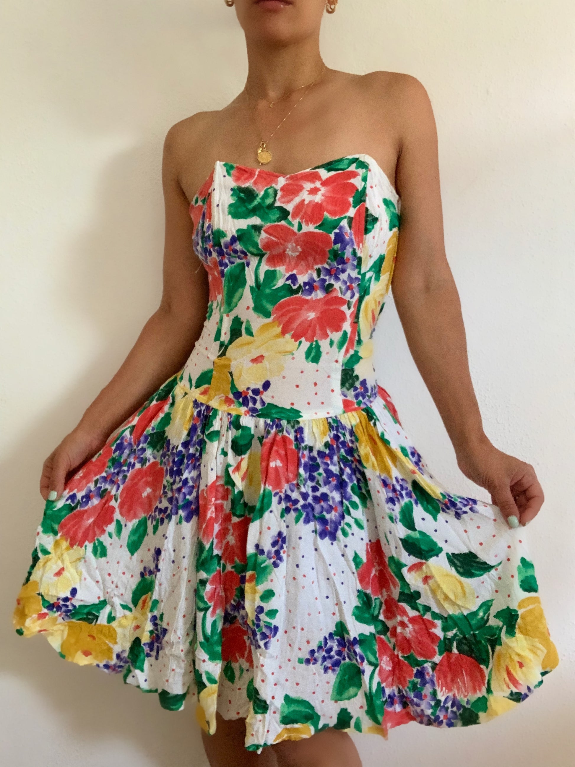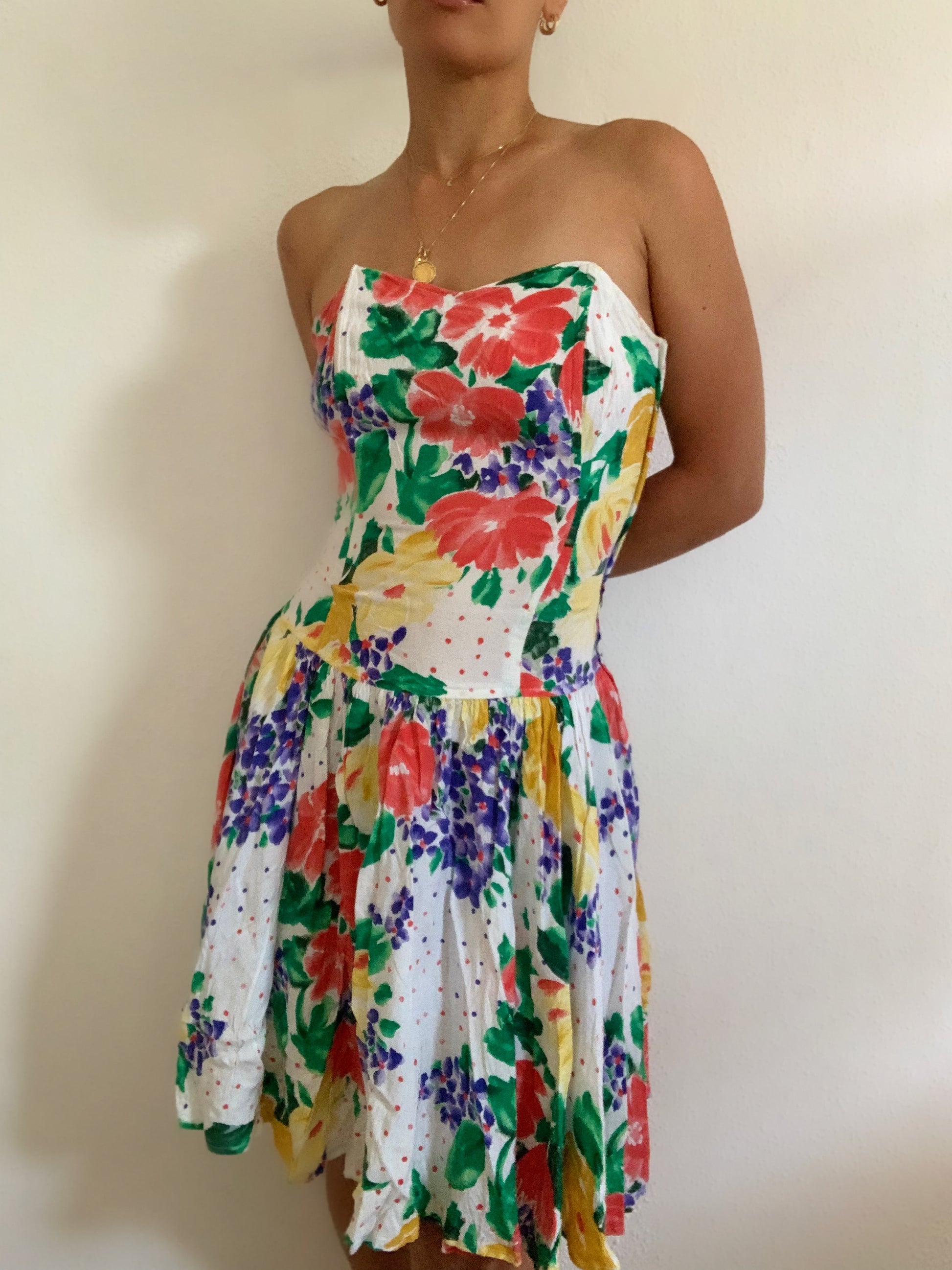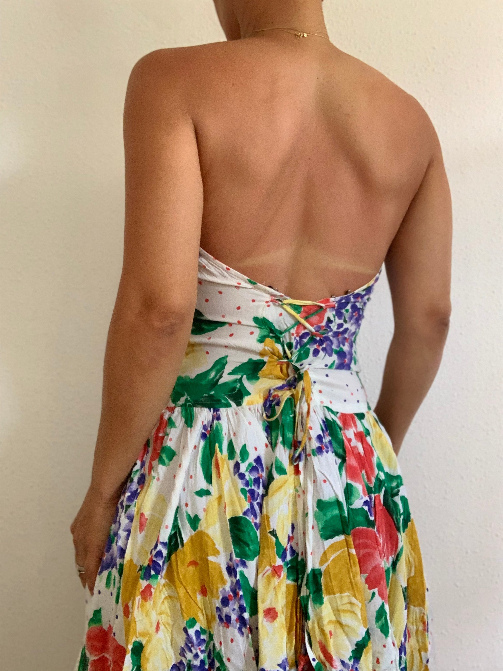 Superbe robe bustier style corset, blanche à fleurs et laçage au dos.