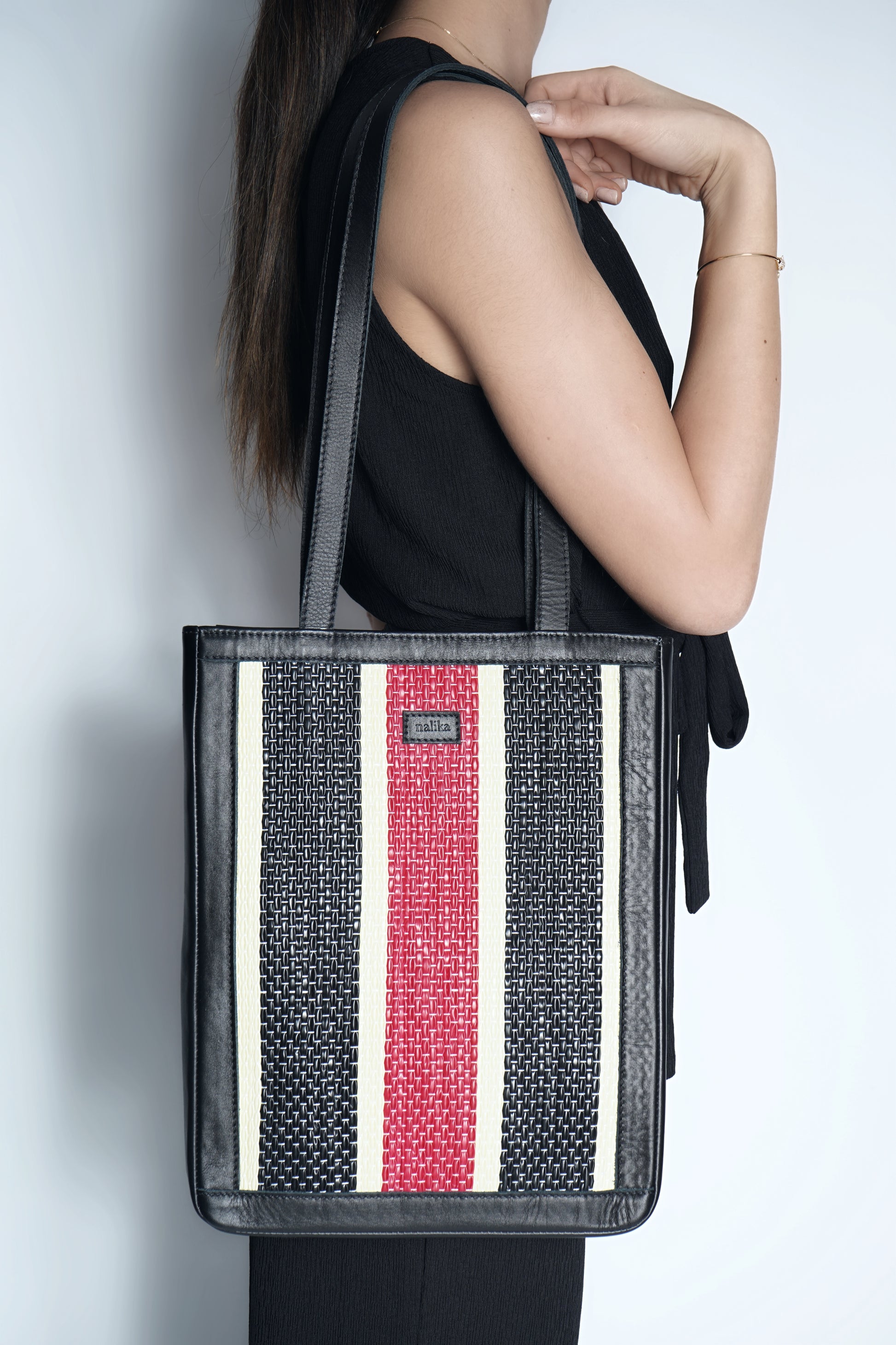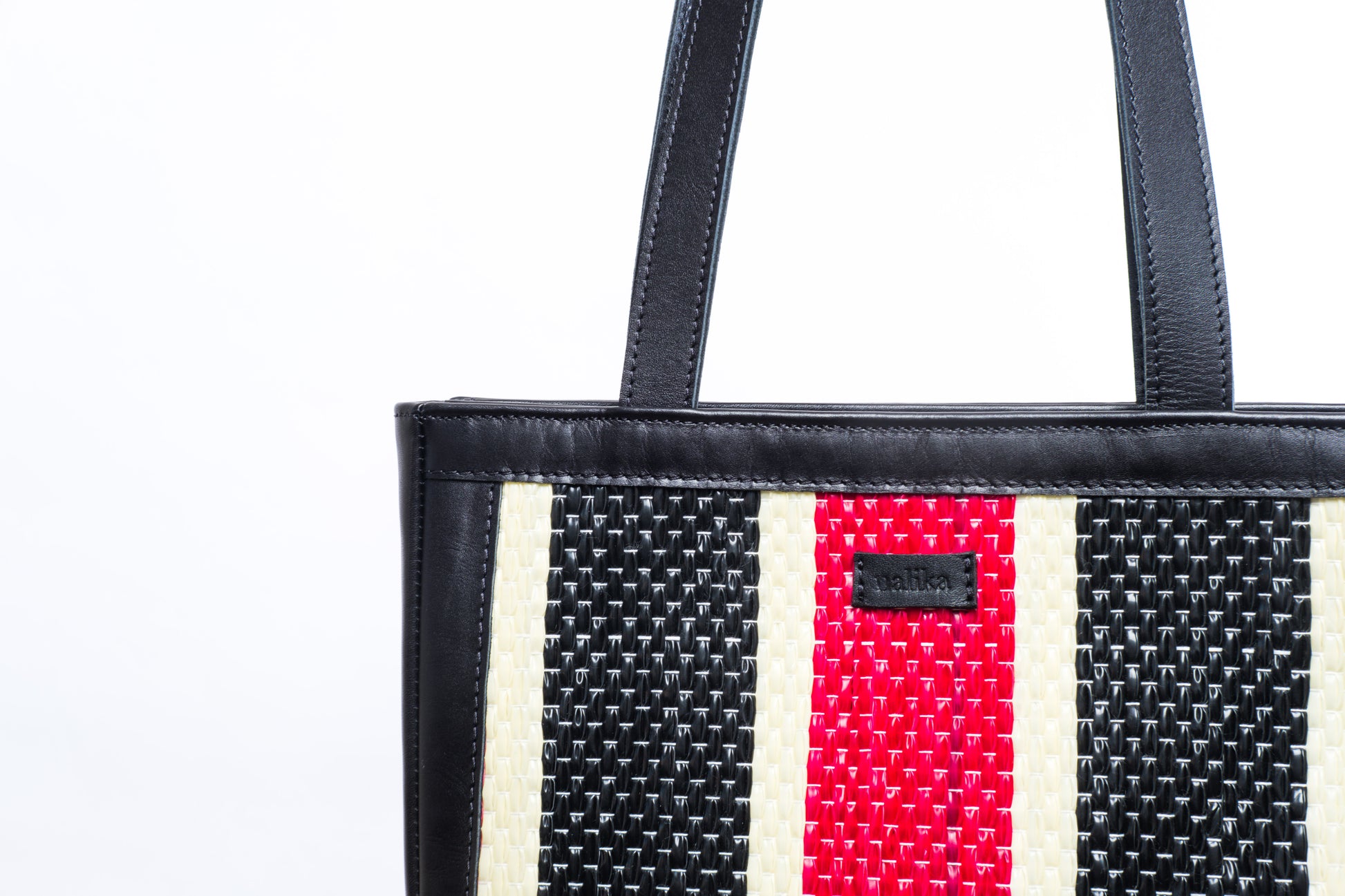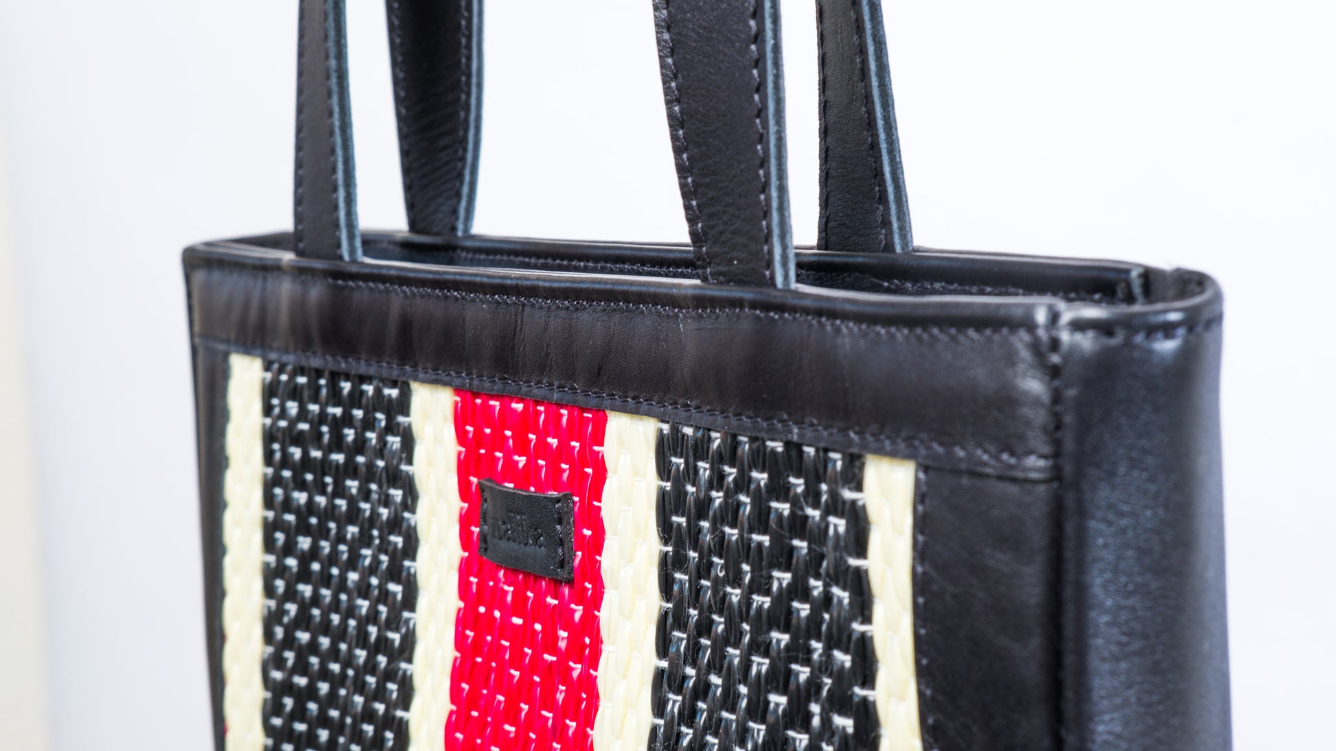 Beautiful and practical totebag made from the typical "hssira" plastic braided carpets and calf leather remnants. Coton lining. Handmade in Marrakech